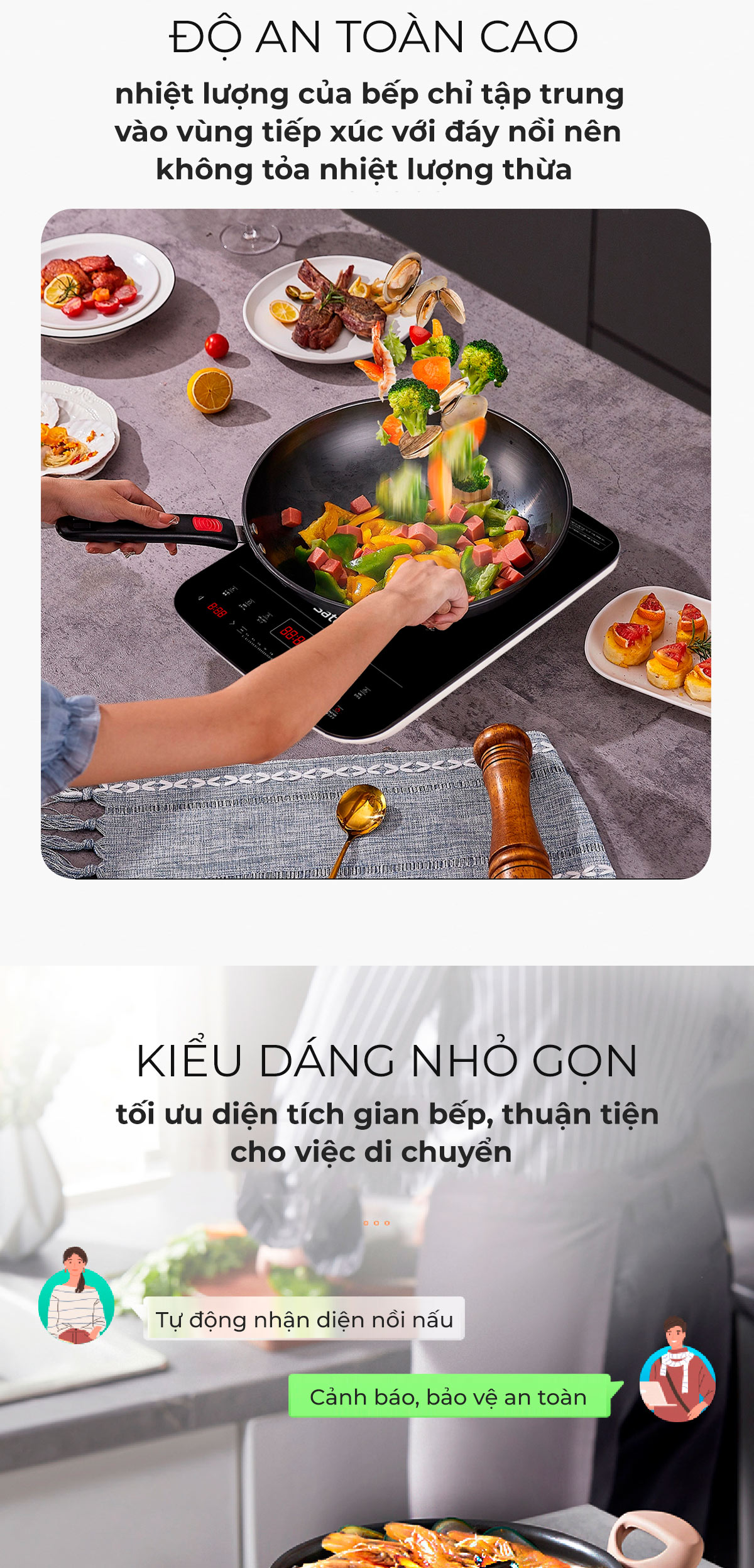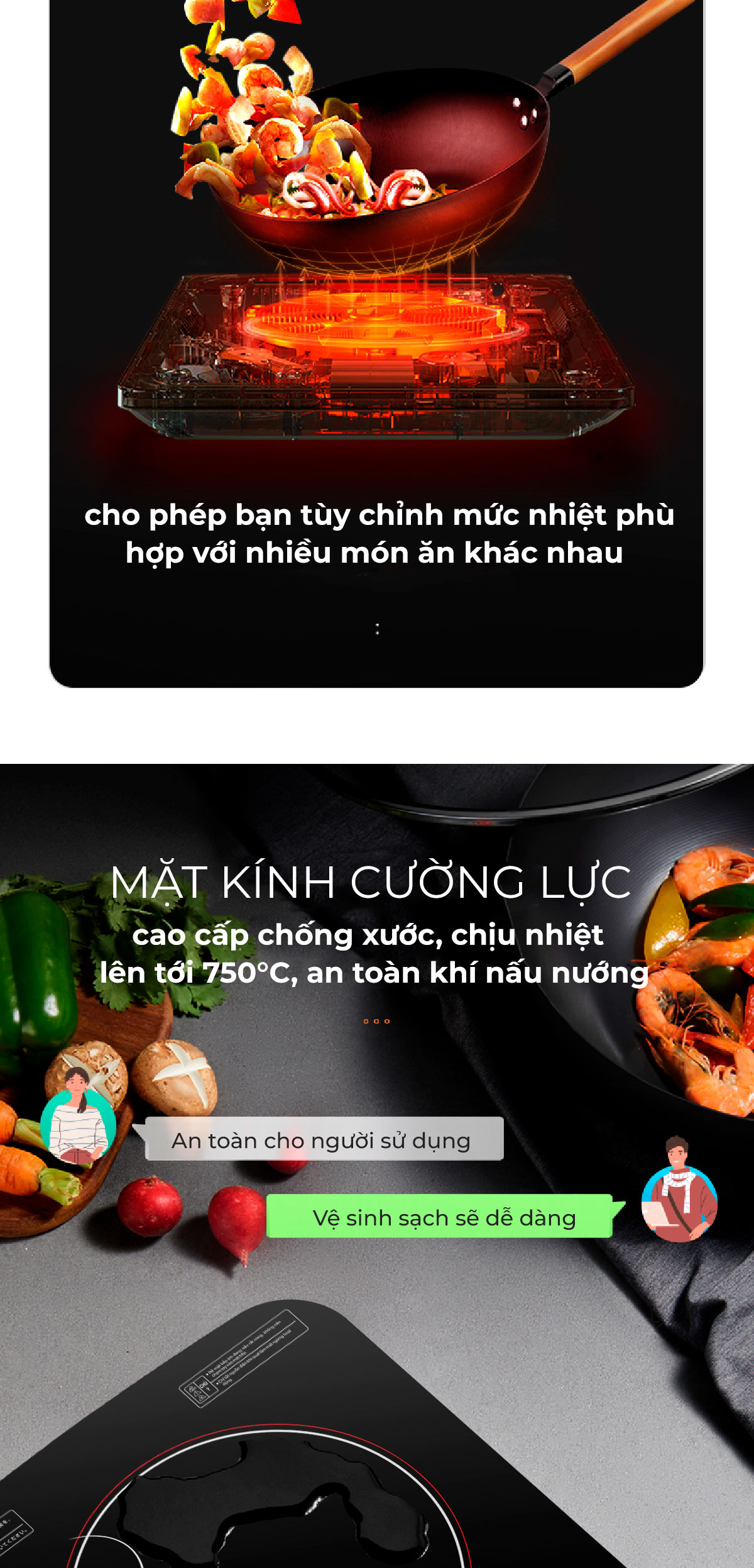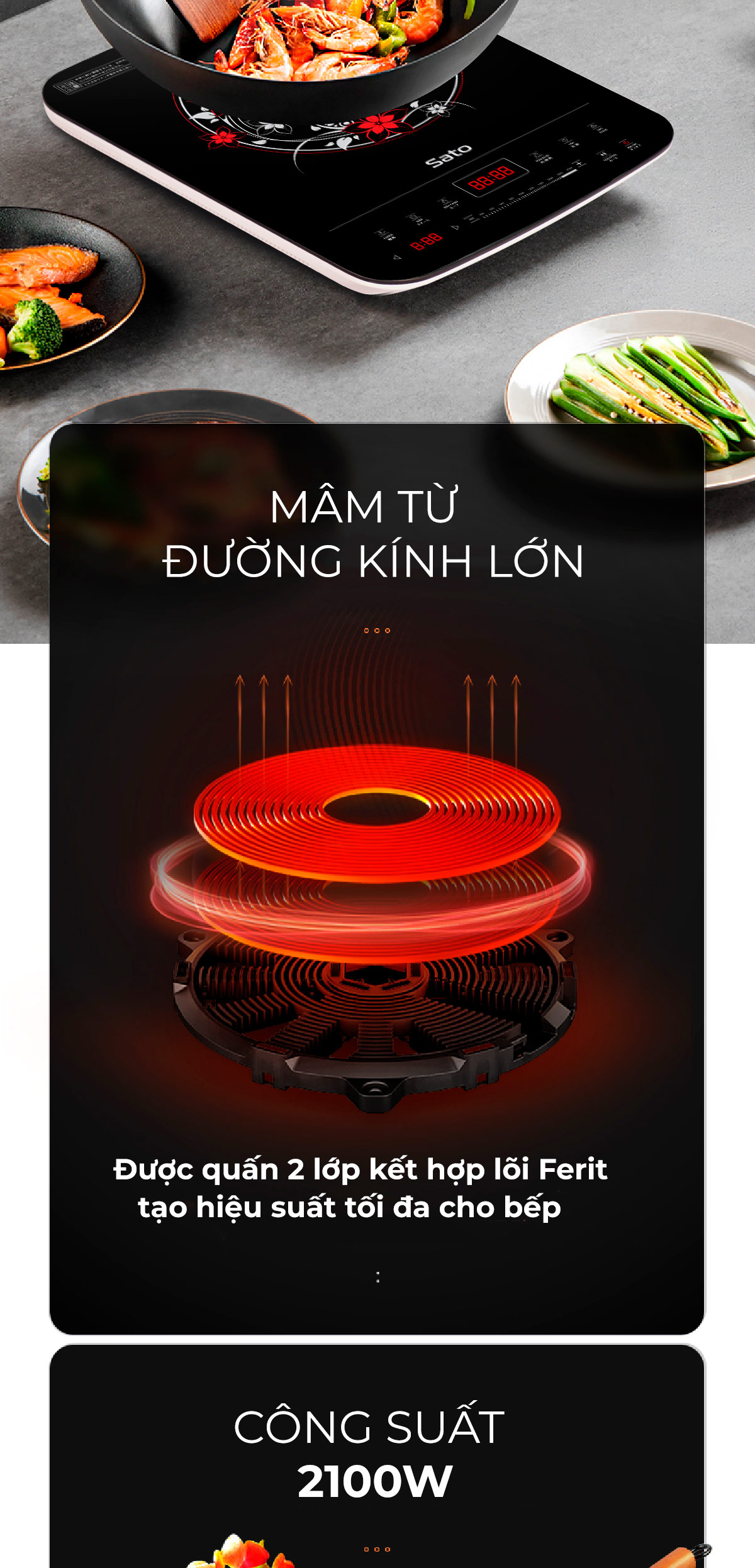 - Mâm từ đường kính lớn được quấn 2 lớp kết hợp lõi Ferit tạo hiệu suất tối đa cho bếp, độ bền cao, tiết kiệm điện năng tiêu thụ.